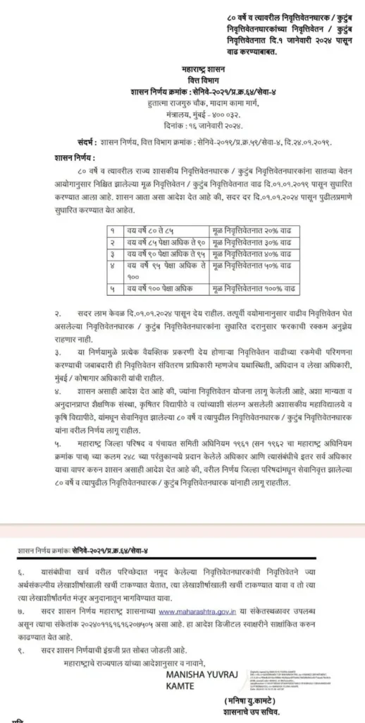 - सदर वयानुसार निवृत्तीवेतन वाढ 1 जानेवारी 2024 पासून लागू करण्यात आली आहे.